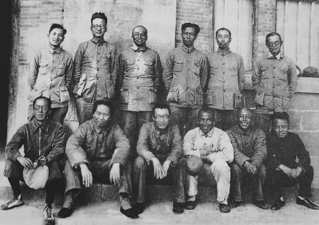 党的扩大的六届六中全会主席团成员合影。前排左起:康生、毛泽东、王稼祥、朱德、项英、王明;后排左起:陈云、博古、彭德怀、刘少奇、周恩来、张闻天