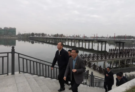 在县委书记刘勇等的陪同下,蔡松涛一行从天赐路到天赐桥,现场听取光山拥河发展战略规划汇报;沿滨河北路经前楼桥转滨河南路至临仙桥,现场听取火车站管理区发展规划和京九高铁、襄合高铁站线规划设计;沿滨河南路到盛湾公园,徒步盛湾人行桥看沿河生态治理环境。县官指办、发改委、火车站管理区介绍说,小潢河光山段全长48公里,流经光山12个乡镇街区,流域面积919平方公里,是光山人民的母亲河。2015年,县委县政府提出践行习近平生态文明思想,实施拥河发展战略,原定10到15年的治理规划,通过全县干部群众和社会各界的同心、同向、同力,仅用4年多时间,就全面完成了以路、桥、坝、点、园为抓手的三批48个项目建设任务。让龙山大闸至天赐桥段,“一池春水洗云天,十里画廊秀两岸”变成现实,促进了光山城市品质和人民生活幸福感的大幅提升。