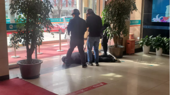 上午10时30分,演练正式开始。在医院门诊大厅,一名“暴徒”因故产生不满情绪,对导医台人员言语威胁,并企图攻击。附近保安立刻上前制止,“暴徒”情绪激动,突然掏出刀具试图伤害。导医台人员立即一键报警,同时拨打110。附近安保人员迅速赶至现场进行增援,按照应急演练预案要求手持盾牌、钢叉等器械与“歹徒”搏斗,并成功将其制服与控制,移交到医院警务工作室。