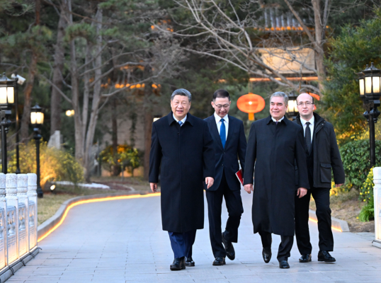 3月18日下午,国家主席习近平在北京钓鱼台国宾馆会见来华进行友好访问的土库曼斯坦民族领袖、人民委员会主席别尔德穆哈梅多夫。这是习近平同别尔德穆哈梅多夫一起散步。新华社记者 申宏 摄